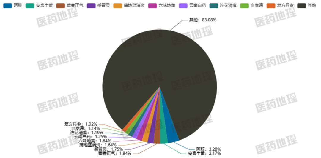 2025年Q2国内中药市场销售额TOP10药品榜单呈现出较为分散的竞争格局,这表明中药市场品类极度丰富,头部品牌的集中度相对较低。阿胶(3.28%)超越安宫牛黄(2.17%)成为销售额最高的单一药品,凸显了其作为传统滋补瑰宝在女性健康、气血滋补领域的强大消费认知和高端礼品市场的坚挺需求。经典名方代表——藿香正气(1.84%)和六味地黄(1.64%)分别占据了胃肠道用药和补肾滋阴领域的头部地位,反映出市场对经过历史验证的经典药物的持续信赖。