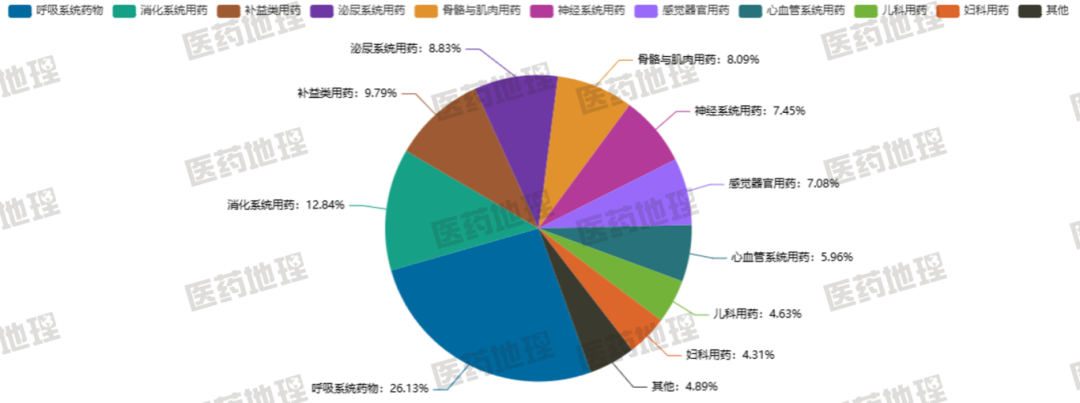 2025年Q2国内中药市场销售额TOP10治疗大类呈现出“一超多强”的格局。呼吸系统药物以26.13%的绝对优势占据市场主导地位,这既体现了季节性流行病需求拉动,也反映出中药在感冒、咳嗽等常见呼吸道疾病治疗中的不可替代性;消化系统用药占比12.84%,位居第二;补益类用药(9.79%)作为第三大品类,凸显了"治未病"中医理念的深入人心与现代人对增强免疫、抗疲劳等养生需求的持续增长。此外,神经系统(7.45%)、心血管系统(5.96%)等慢性病用药同样占据一定市场份额,印证中药在慢病管理领域的深度渗透;而妇科(4.31%)、儿科(4.63%)等专科用药虽占比较小,但也显示出中药在细分市场的精准定位能力。这种市场结构既反映了中药"常见病优势突出、慢病管理稳固、专科特色鲜明"的产业特征,也预示着未来将从治疗向预防保健、从广谱向精准细分的发展趋势。