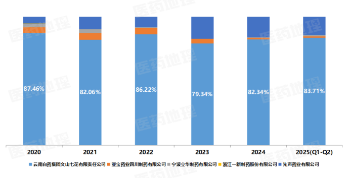气血康口服液作为OTC甲类品种,以“健脾固本、滋阴润燥、生津止咳”为核心功效,精准对应现代人群普遍存在的亚健康状态,如神倦乏力、气短心悸等,受众广泛且需求明确。在2025年上半年多数品类增长疲软的背景下,该产品实现逆势高增长,实体药店销售额逼近3亿元,同比增长18.07%(图5),印证了其产品力与市场需求的高度契合。从长期表现看,该产品自2023年起便在药店渠道销售额站稳5亿元大关,并保持增长态势。云南白药文山七花作为主导企业,自2020年以来持续占据约80%的市场份额(图6),显示出强大的品牌壁垒与市场控制力。